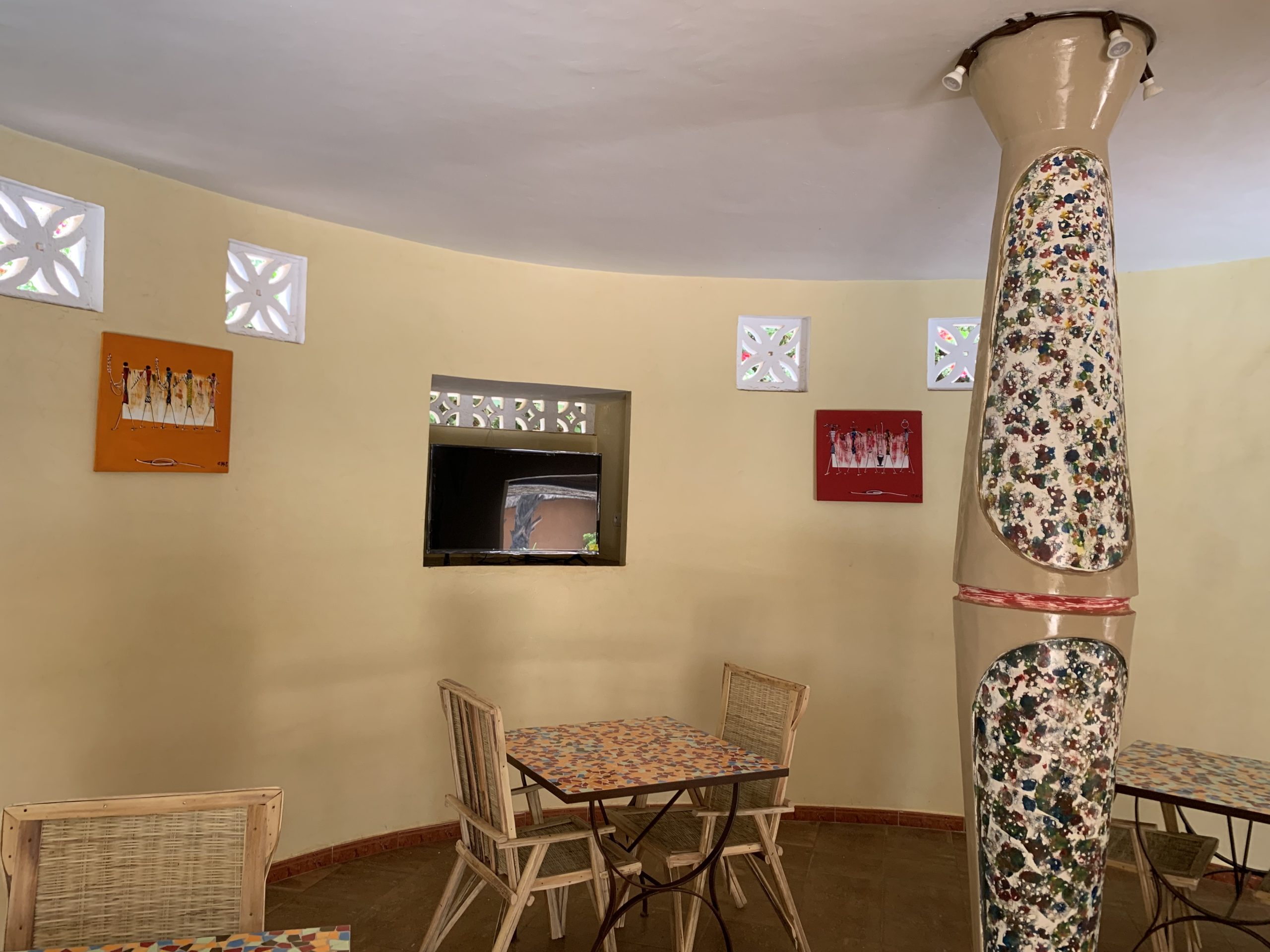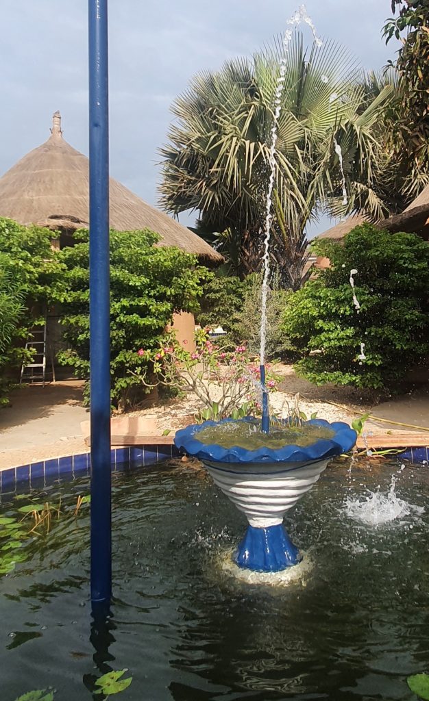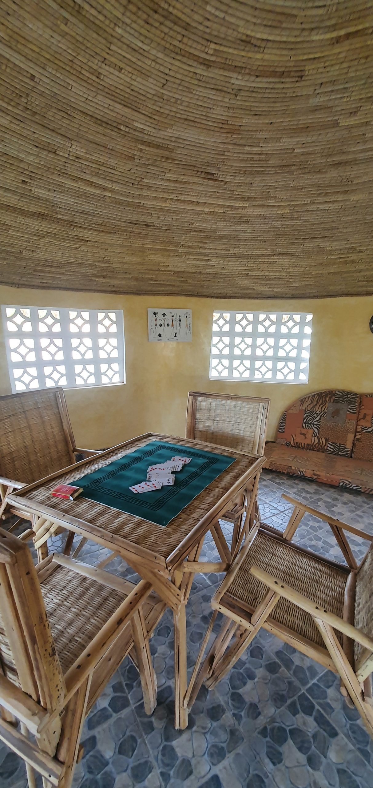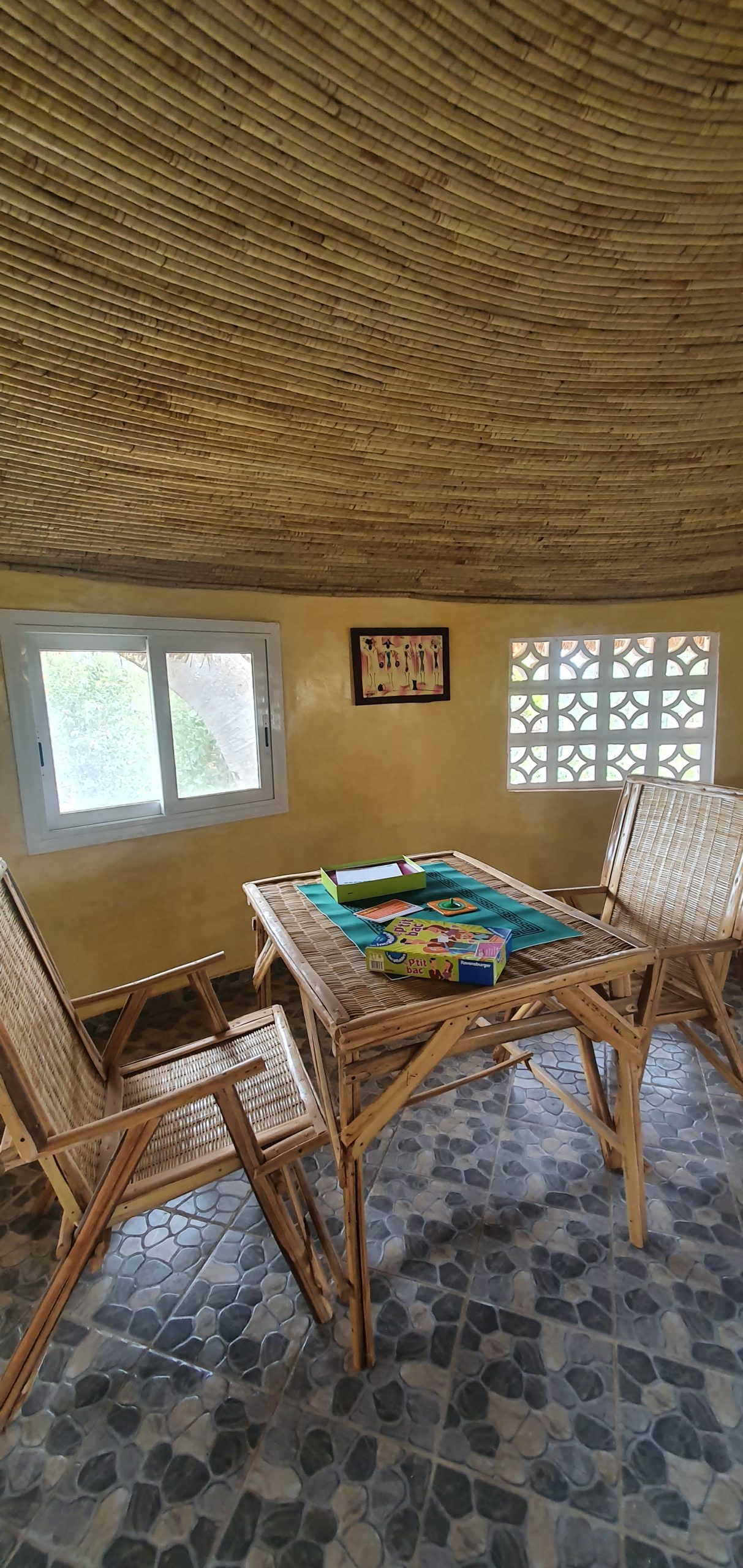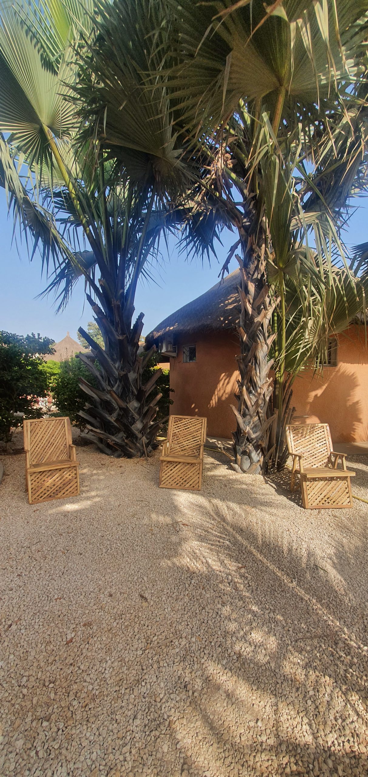Pour rester en harmonie avec la nature, nous avons choisi pour vous un maximum de mobilier en rônier, travail exceptionnel de Léonie, artisane dans un village de rôniers. Ainsi les chaises du restaurant, les salons de la salle de repos, les fauteuils autour de la piscine ou du bassin à poissons, les salons privés des cases, les étagères et les lampes de chevet sont ses réalisations.