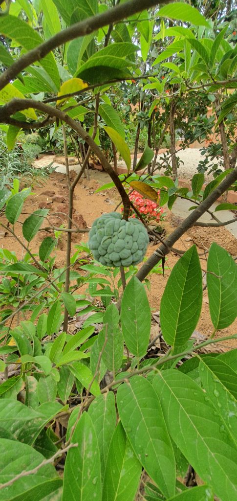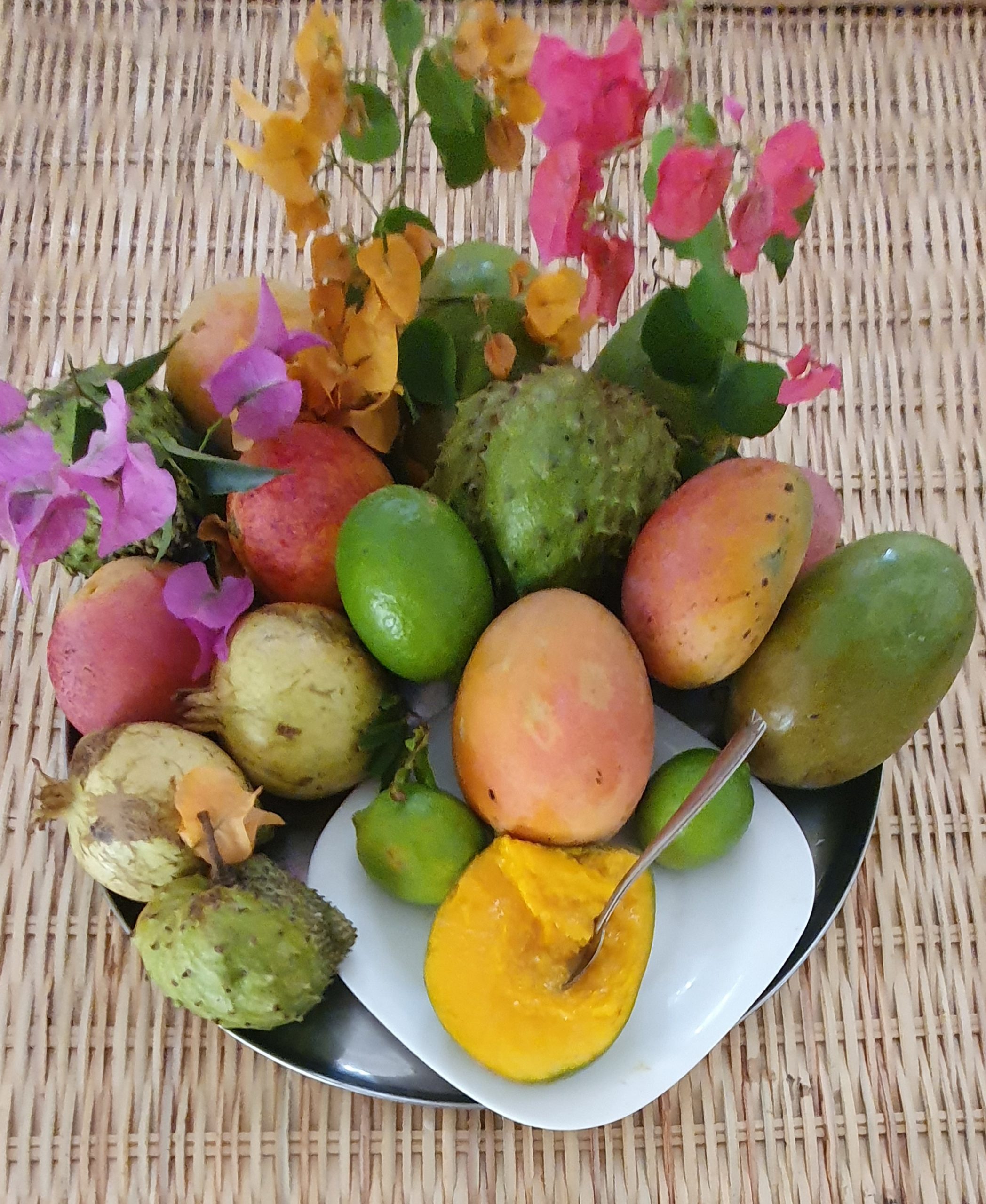 Ainsi, au fil des saisons, vous aurez la joie de déguster mangues, corossoles, papayes, goyaves, pommes cannelle, sapotes, grenades, bananes, ainsi que les agrumes, citrons, pamplemousses, mandarines et oranges. Un vrai régal !