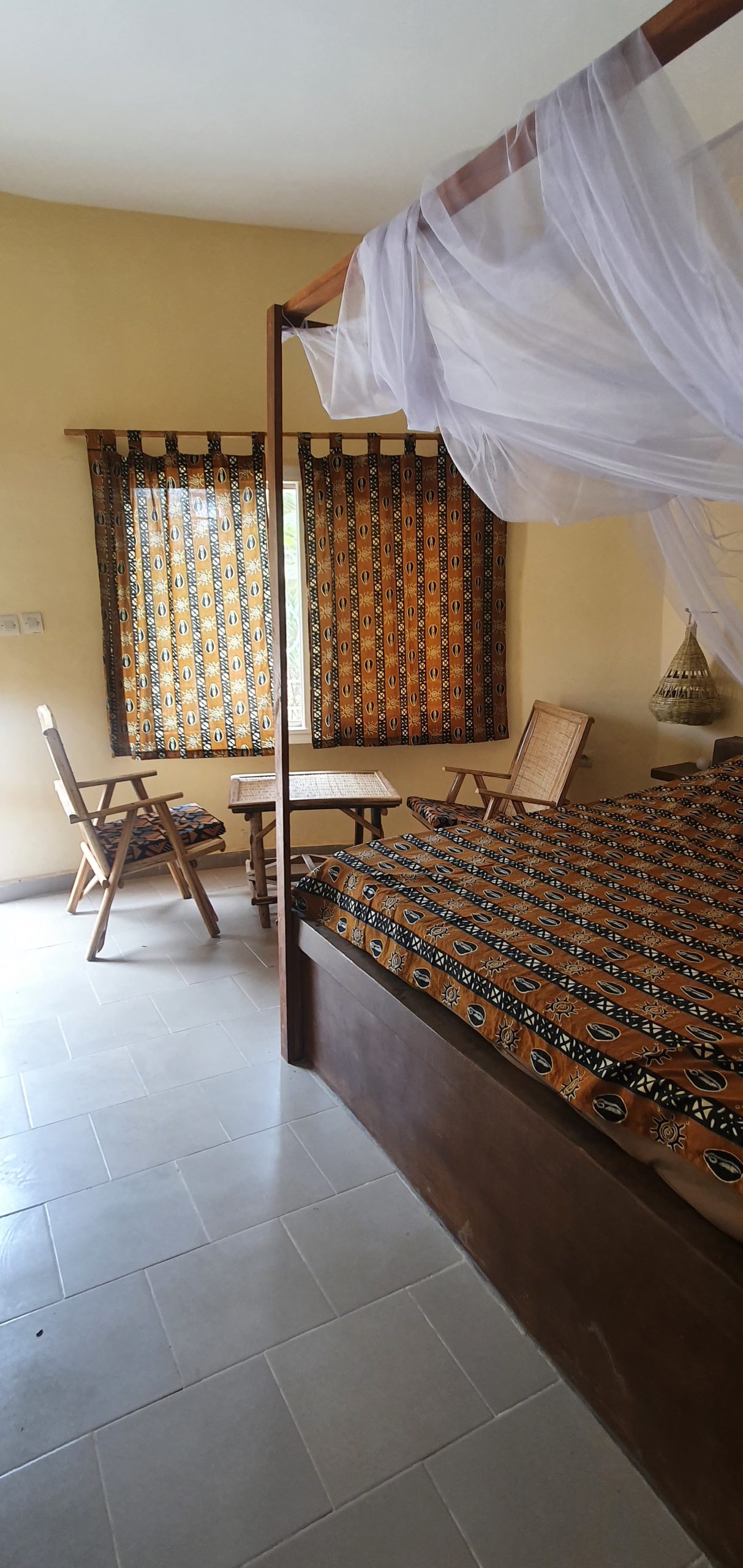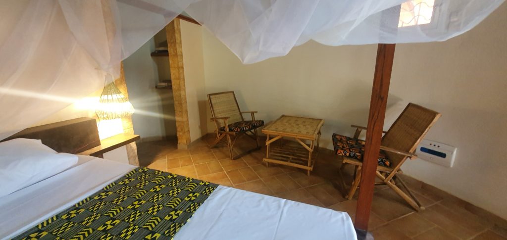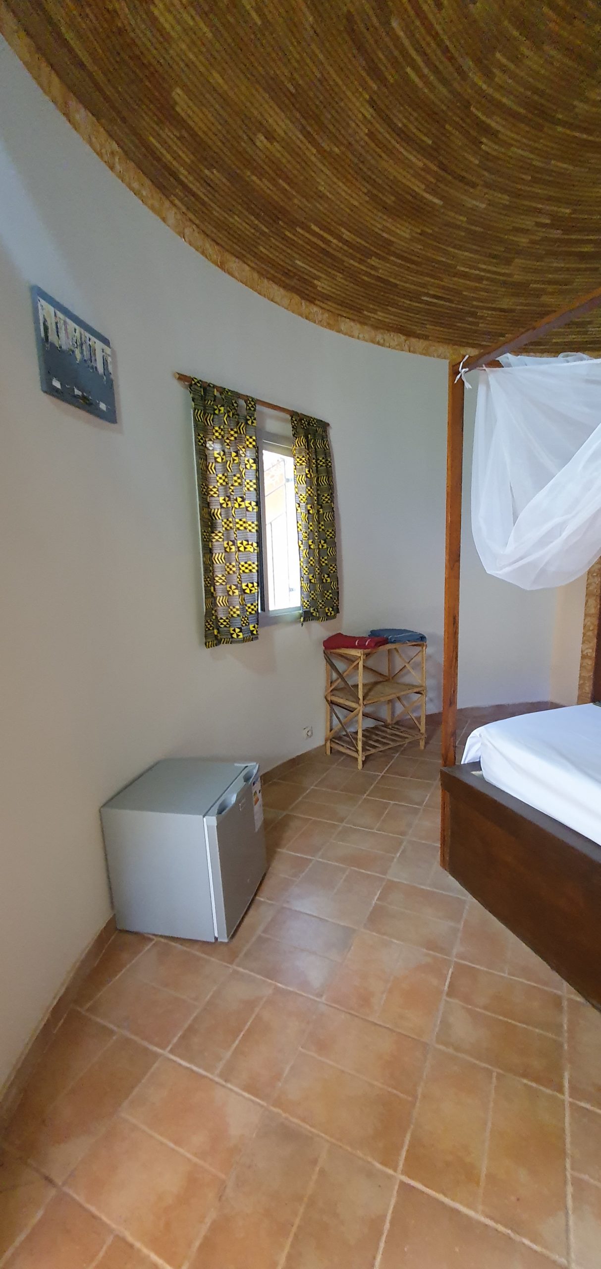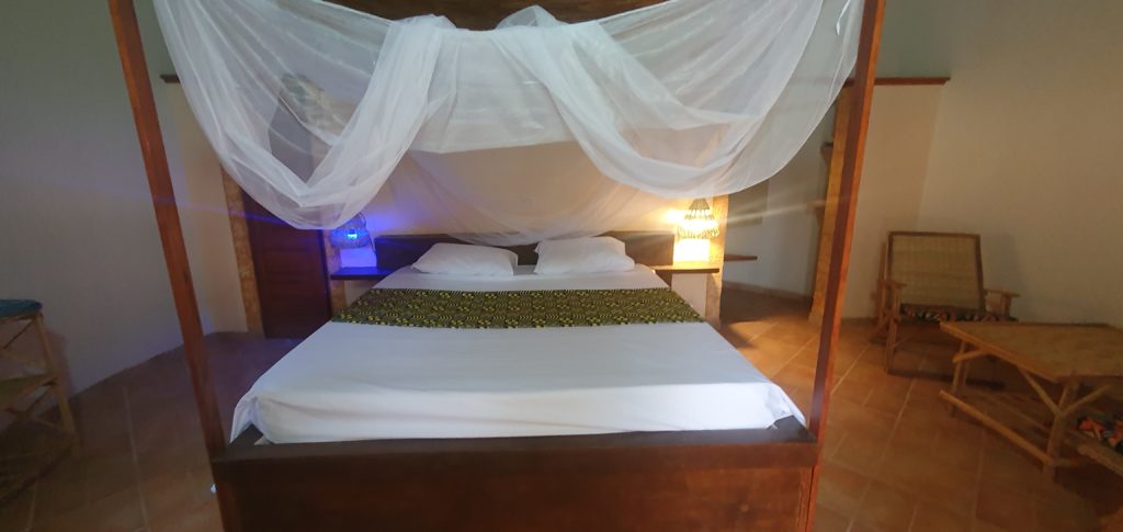 Tout le confort nécessaire est présent : Un grand lit double de 180 de large, une penderie, des étagères et un salon en rônier, un frigo-bar, une moustiquaire, un ventilateur et le climatiseur.