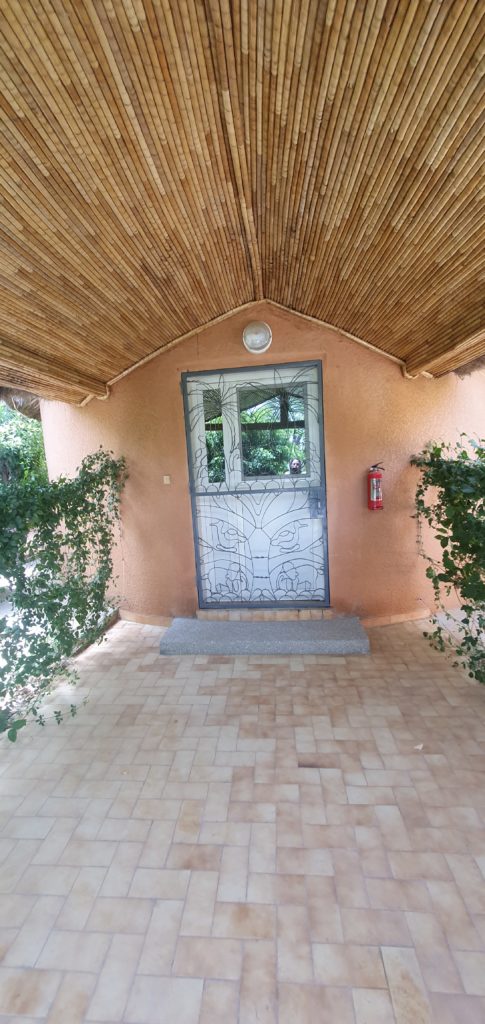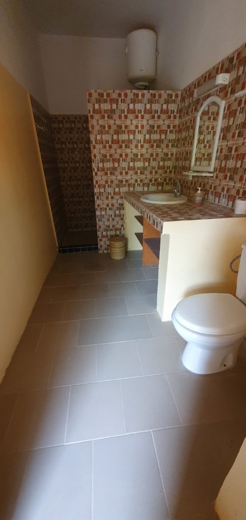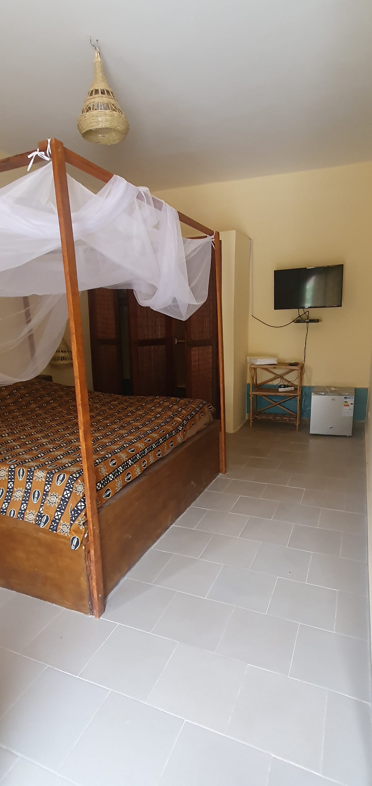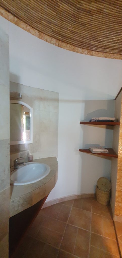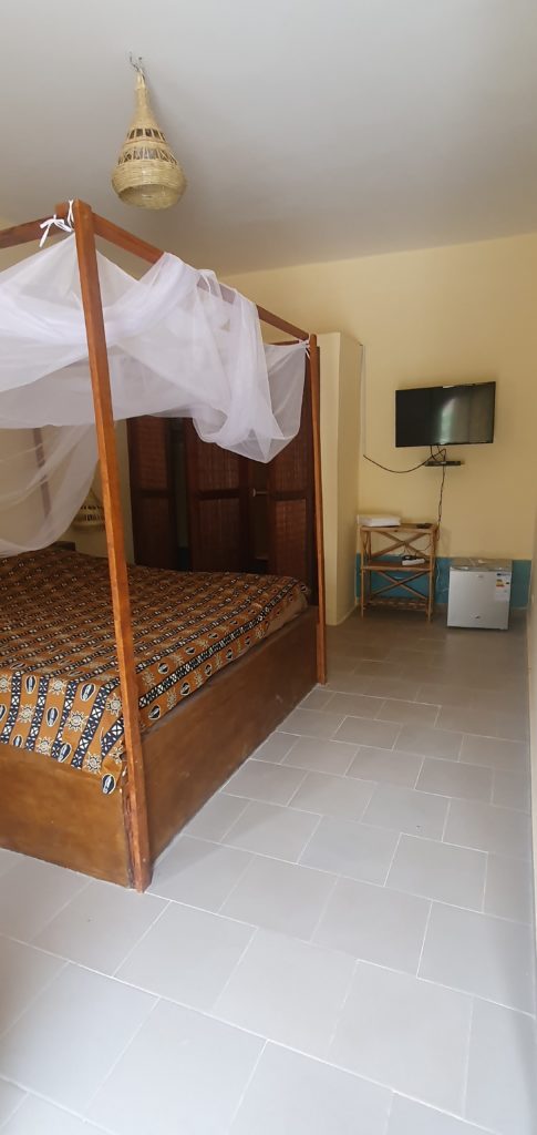 Tout le confort nécessaire est présent : Un grand lit double de 180 de large, une penderie, des étagères et un salon en rônier, un frigo-bar, une moustiquaire, un ventilateur et le climatiseur.